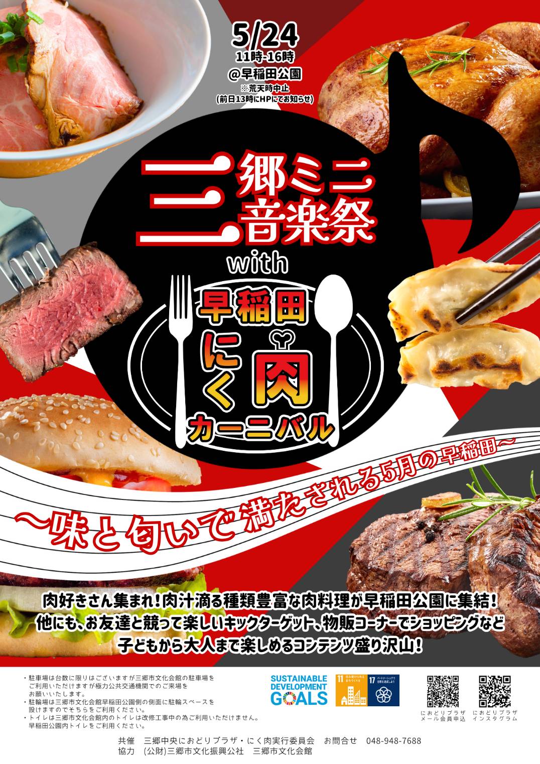 文化会館による「三郷ミニ音楽祭」と三郷中央におどりプラザ&にく肉実行委員会による「早稲田にく肉カーニバル」の同時開催!